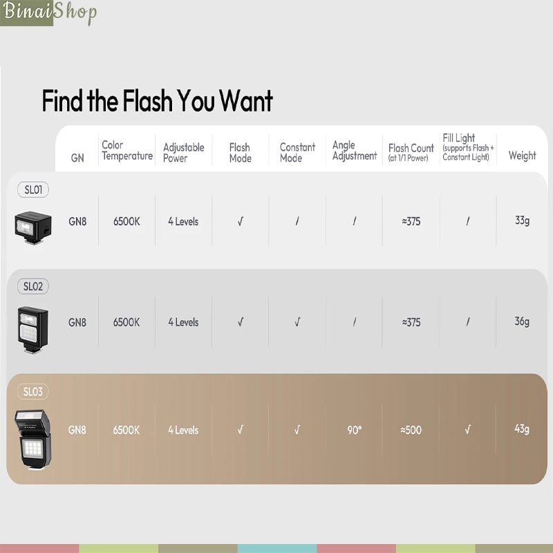 Mua tại Tiktok- Đèn Flash Ulanzi SL01 / SL02 / SL03 có thiết kế siêu nhỏ gọn, trọng lượng chỉ khoảng 33–43g với cường độ GN8 cho ánh sáng mạnh và đều. SL02 tích hợp thêm chế độ đèn chiếu sáng liên tục