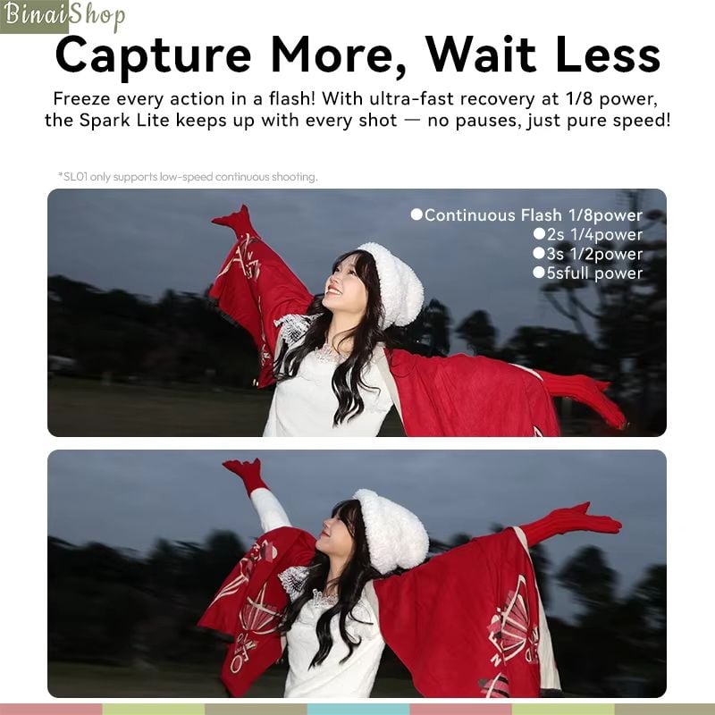 - Hỗ trợ chế độ hồi sáng nhanh với SL01/SL02 ở mức 1/8 công suất có thể nháy liên tục trong vòng 5 giây và 0.8–2.5 giây tùy công suất ở mức 1/8 có thể chụp liên tục ngay lập tức dành cho SL03.