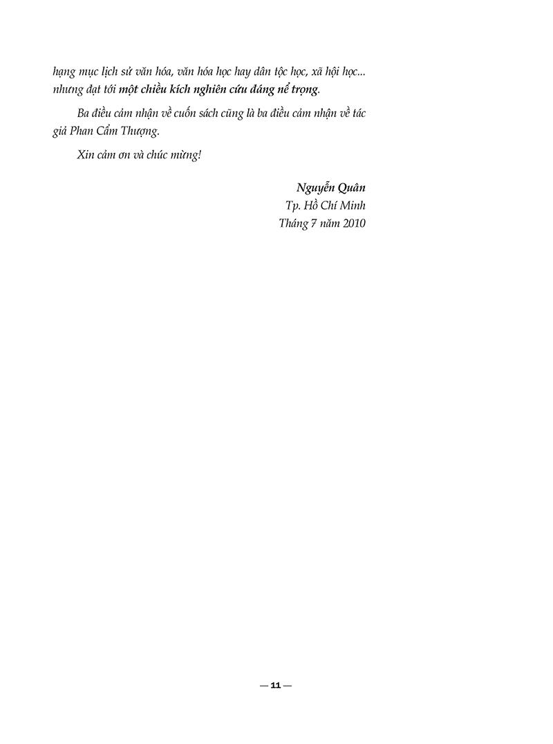 “Nhà vua thường thức giấc vào cuối giờ Dần, khoảng bốn rưỡi sáng, để còn kịp chỉnh trang cho buổi đăng triều, nếu không phải lên triều, ngài có thể dậy muộn hơn một canh giờ. Một thái giám bưng cho ngài một chén trà thuốc súc miệng, nhấp thử trước một ngụm, sau mới dâng lên hoàng đế, rồi ngài nhổ ngụm nước vào ống nhổ bạc miệng rộng. Ngài vén quần ngồi vào chiếc ghế vệ sinh, dưới có đặt một chậu sành. Hoàng cung phong kiến từ thời Hán từng có một ông vua bị ám sát ngay trong nhà xí, nên nó không bao giờ được xây nữa. Vua, hoàng hậu và cung nữ đều đại tiểu tiện bằng chậu. Riêng chậu của vua được ngự y giữ lại để nghiên cứu sức khỏe của ngài ngự qua phân. Xong xuôi, thái giám dùng khăn mềm lau sạch, rồi thấm một chút mật ong vào hậu môn của ngài. Vua khoan thai đi một bài quyền dưỡng sinh trên phương đình của ngự uyển, cũng tại đó, thái hậu đã chuẩn bị bữa sáng đạm bạc, gồm một ấm trà sâm, một đĩa bánh nhỏ bằng bột gạo trứng và mật ong do đích tay bà làm, một bát miến gà. Tất cả món ăn đều được thái hậu kiểm tra và cho người nếm thử. Hai thị nữ sẽ lau người cho ngài bằng nước ấm, thay quần áo trong, rồi khoác bên ngoài áo trong một bộ hoàng bào màu trắng, thêu rồng vàng, nếu ngài không lên triều. Vua được chải tóc vấn thành búi giữa đỉnh đầu rồi lồng vào đó một mũ miện vàng khít với nhục kháo (búi tóc), xỏ giầy đen bằng nhung. Ngài đến ngự thư phòng bắt đầu duyệt tấu sớ.” Đây là đoạn trích miêu tả buổi sáng thường nhật của một bậc đế vương nước Việt thuở xưa trong cuốn Văn minh vật chất của người Việt – công trình khảo cứu tâm huyết cả một đời của họa sĩ, nhà nghiên cứu văn hóa Phan Cẩm Thượng. Điều đặc biệt là cảnh sinh hoạt sinh động đầy màu sắc như một đoạn phim này không phải được phục dựng từ những trang sử, cũng không phải từ trí tưởng tượng của tác giả viết ra, mà là qua việc gạn lọc những thông tin tế vi đang mã hóa trong những đồ vật của các vương triều còn sót lại và lưu giữ cho đến ngày nay. Đây cũng chính là điểm đặc biệt và khác lạ nhất của Văn minh vật chất của người Việt – phương pháp tiếp cận và vẽ lại lịch sử hình thành và phát triển của dân tộc Việt thông qua những trầm tích thông tin ẩn tàng trong các đồ vật, từ những thứ dung dị trong cuộc sống hàng ngày đến những món đồ vàng son của các bậc đế vương. Trước tác giả Phan Cẩm Thượng, chưa từng có công trình khảo cứu nào tiếp cận lịch sử văn minh dân tộc thuần nhất từ góc độ này. Bằng sự nhạy cảm đặc biệt của các họa sĩ, trí tưởng tượng của một nhà văn kết hợp với sự tỉ mẩn, óc khoa học của một nhà nghiên cứu, tác giả Phan Cẩm Thượng đã có thể khiến các đồ vật tưởng chừng “vô tri” phải cất lời bằng thứ mật ngữ của riêng chúng, để kể lại những câu chuyện về bao nếp ăn, nếp sống, nếp làm của hàng ngàn năm người dân Việt hiện lên rõ ràng, sinh động, tươi tắn một cách khác thường mà có lẽ không cuốn sách sử hay báo cáo khảo cổ học nào khác có thể làm được.