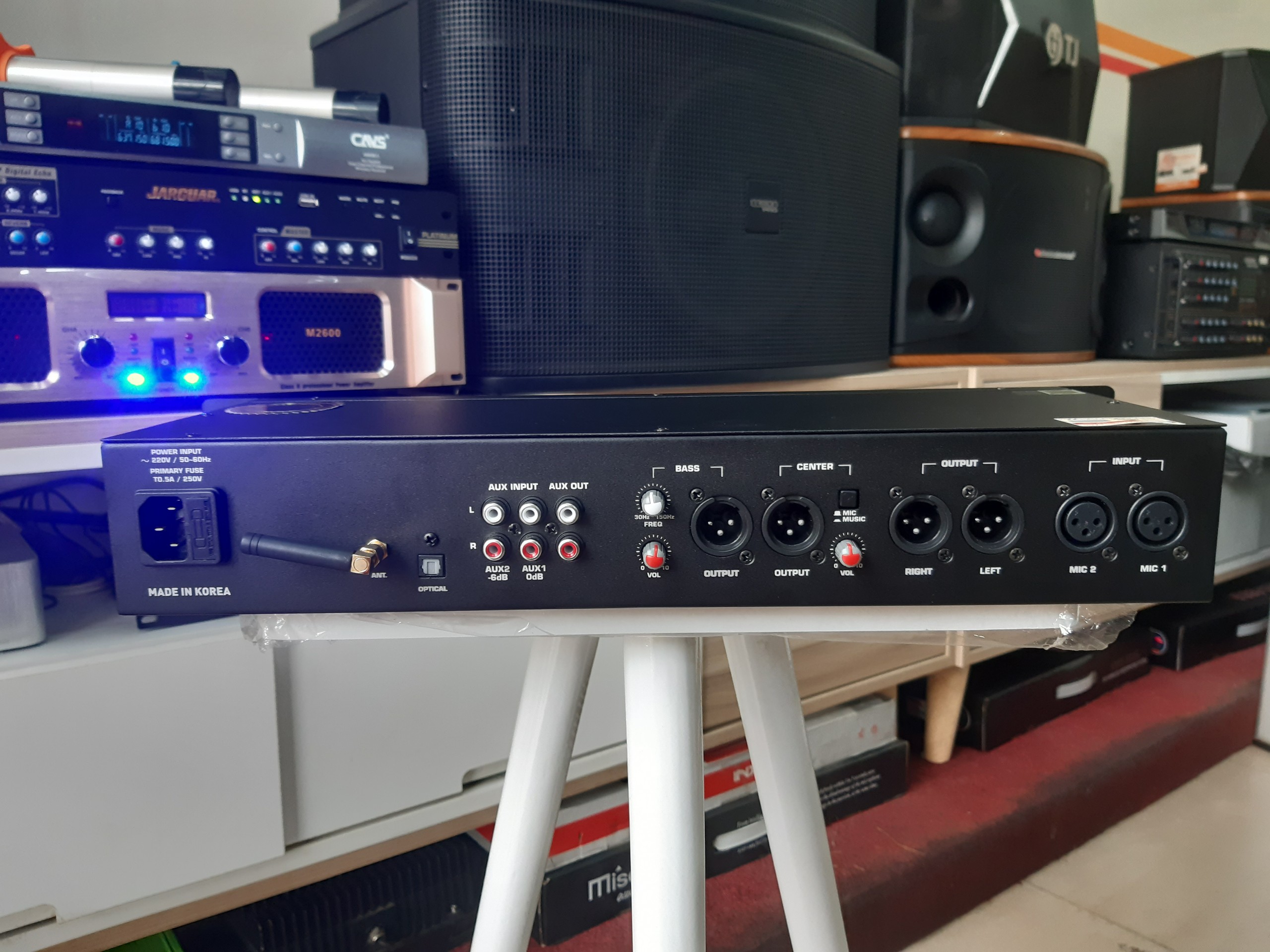 Main đẩy liền Vang JA S6-500 - Hàng Chính Hãng MAIN LIỀN VANG S6 - 500 là dòng thiết bị âm thanh thông minh cho dàn combo Karaoke của bạn. Sản phẩm được tích hợp tính năng củaMAIN CÔNG SUẤT và VANG CƠ, là sự kết hợp giữa tính năng công suất với mạch chỉnh âm hiện đại của vang số cho ra âm thanh đầu ra hay và cực kỳ chất lượng. Với sự tiện ích 2 IN 1 của MAIN LIỀN VANG S6 - 500, giúp cho người tiêu dùng tiết kiêm được chi phí đầu tư cho bộ dàn Karaoke tại gia cũng như tiết kiệm được diện tích sử dụng. Mặt trước của main liền vang: + Với thiết kế hình hộp chữ nhật, kích thước nhỏ gọn 530 x 500 x 220 mm (Rộng x Dài x Sâu) nên bạn dễ dàng sử dụng mà không chiếm nhiều diện tích khi tích hợp với Micro và loa,... + Toàn bộ linh kiện của thiết bị đều được bảo bọc bởi vỏ máy làm từ chất liệu hợp kim cao cấp, bề mặt sơn tông màu đen sang trọng, thời thượng nâng cao khả năng chống han gỉ, bảo vệ sản phẩm bền bỉ hơn. + Main có màn hình LCD ở giữa báo chế độ cường độ âm thanh với các nút vặn volume tắt mở nhạc, tắt mở mic, chỉnh lớn nhỏ Echo, phim bấm được thiết kế 2 bên góp phần tăng thêm tính thẩm mỹ của thiết bị. + Có nút bấm nhanh chuyển chế độ USB, Bluetooth cùng với nút INPUT có chức năng chuyển chế độ kết nối đầu vào trên S6 - 500. + Main có 5 ngõ kết nối micro: 3 cổng ở mặt trước, 2 cổng ở mặt sau. Mặt sau của main liền vang: + Mặt sau của thiết bị là hệ thống các đường kết nối tín hiệu âm thanh vào và ra, các cổng kết nối thông dụng của thiết bị âm thanh và một số thông tin kỹ thuật cơ bản khác. Bên cạnh đó, mặt sau của main còn có quạt tản nhiệt, giúp cho main không bị quá nóng khi hoạt động với cường độ cao. MAIN LIỀN VANG S6 - 500 được tích hợp bởi chip xử lý âm thanh, sau khi âm thanh được main liền vang S6 - 500 xử lý và khuếch đại ra lo chuyên nghiệp với bản nhạc đầy đủ âm sắc, hạn chế tối đa tạp âm, méo hay vỡ tiếng, chống hú rít. Với thiết kế 2 kênh riêng biệt, với mức công suất 500W/ 8Ω và 600W/ 4Ω cùng với 4 đường ra loa nên tăng khả năng kéo được 2 cặp loa Bass mang đến âm thanh sống động, chân thực. Được hỗ trợ 4 cổng kết nối Bluetooth-USB-Optical-COAXIAL-AUX1/AUX2 nên người dùng dễ dàng kết nối với các thiết bị như smartphone, laptop, tablet, tivi thông minh… mang đến trải nghiệm giải trí không giới hạn cho gia đình. Dễ dàng kết hợp với các dòng thiết bị âm thanh được trang bị hệ thống kết nối thông minh, linh hoạt thuận tiện cho quá trình phối ghép với các thiết bị như loa karaoke, loa sub, micro không dây...đem tới bộ dàn hiện đại và chuyên nghiệp nhất và đáp ứng tối đa nhu cầu karaoke, nghe nhạc tại gia hoặc các không gian mở ngoài trời.