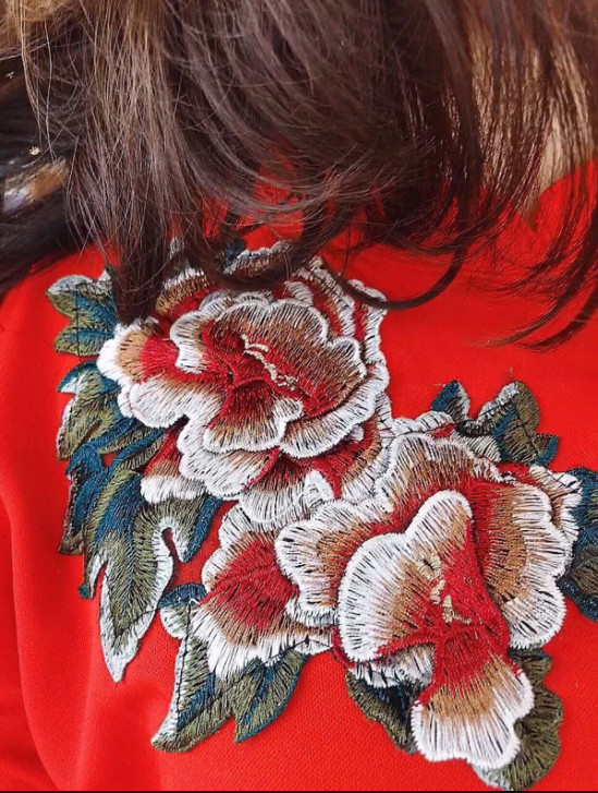 áo dài suông đỏ đô kết chim và hoa , tay lỡ loe