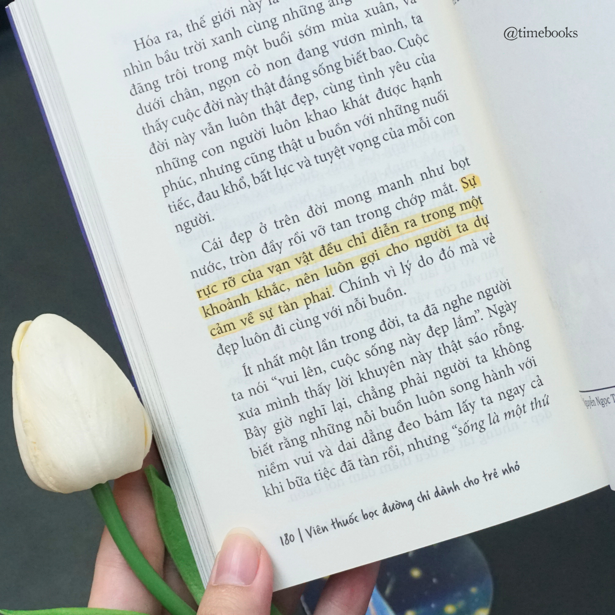 • Mong bạn sẵn sàng dùng mọi giác quan để đón nhận hết thảy niềm vui, nỗi buồn trên hành trình của mình   CHÚNG TA KHÔNG ỔN VÀ ĐIỀU ĐÓ RẤT BÌNH THƯỜNG Có không những ngày bạn rơi vào những suy nghĩ tiêu cực rồi tự chán ghét bản thân vì những suy nghĩ ấy? Bạn tự nói với mình là phải thoát ra khỏi vòng xoáy tiêu cực này thôi nhưng lại bất lực khi thấy bản thân ngày càng trở nên chán nản.  Đã bao giờ bạn cảm thấy mệt mỏi vì những ý nghĩ “hãy vui lên đi”, “hãy sống thật tích cực” chưa?   Nếu bạn đang trải qua những cảm xúc như vậy thì hãy để cuốn sách “Viên thuốc bọc đường chỉ dành cho trẻ nhỏ” cùng bạn vượt qua nhé. Cuốn sách cần bạn chậm rãi đọc để hiểu rằng đôi khi có những cảm xúc trật ra khỏi vòng quay kiểm soát của tâm trí, những cũng không sao cả! Tất thảy cảm xúc mới vẽ nên cuộc sống muôn màu, vẽ nên chúng mình ngày hôm nay vững vàng hơn hôm   Những lời văn nhẹ nhàng mà sâu lắng trong cuốn sách sẽ từ từ vỗ về và chữa lành trái tim bạn.