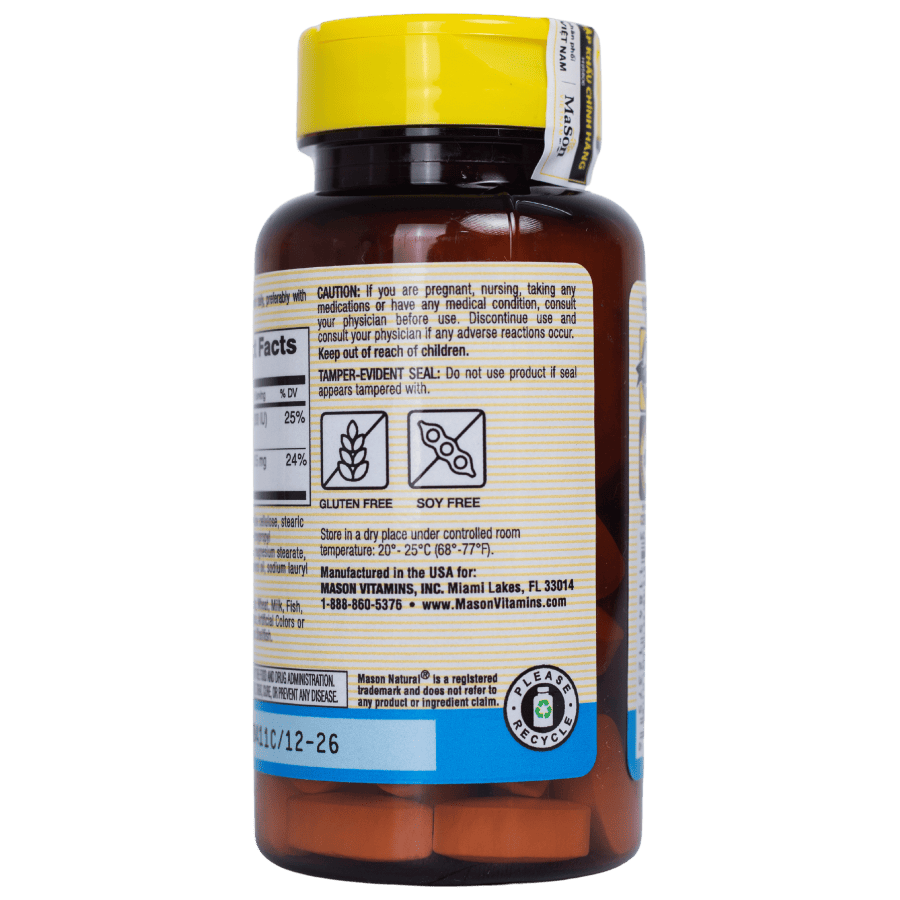 - Không sử dụng nếu tem niêm phong bị rách hoặc có dấu hiệu làm giả. Một số thông tin về thương hiệu Mason Natural Mason Natural là thương hiệu thực phẩm bảo vệ sức khỏe uy tín tại Mỹ, được thành lập từ năm 1967. Với sứ mệnh "Cung cấp cho khách hàng những giá trị và sản phẩm tốt nhất vì khách hàng xứng đáng được nhận", Mason Natural đã không ngừng nghiên cứu và cải tiến để mang đến hơn 300 sản phẩm chất lượng cao, đáp ứng đa dạng nhu cầu chăm sóc sức khỏe của người tiêu dùng. Các sản phẩm Mason Natural đều được sản xuất theo quy trình khép kín, tuân thủ tiêu chuẩn cGMP. Đồng thời các sản phẩm của Mason còn đáp ứng các tiêu chuẩn khắt khe tại Mỹ và đặc biệt phải đáp ứng các tiêu của FDA Hoa Kỳ. Hiện nay, Mason Natural đã có mặt tại hơn 70 quốc gia, trong đó có Việt Nam. Số ĐKCB: 4863/2024/ĐKSP Lưu ý: Sản phẩm này không phải là thuốc, không có tác dụng thay thế thuốc chữa bệnh.