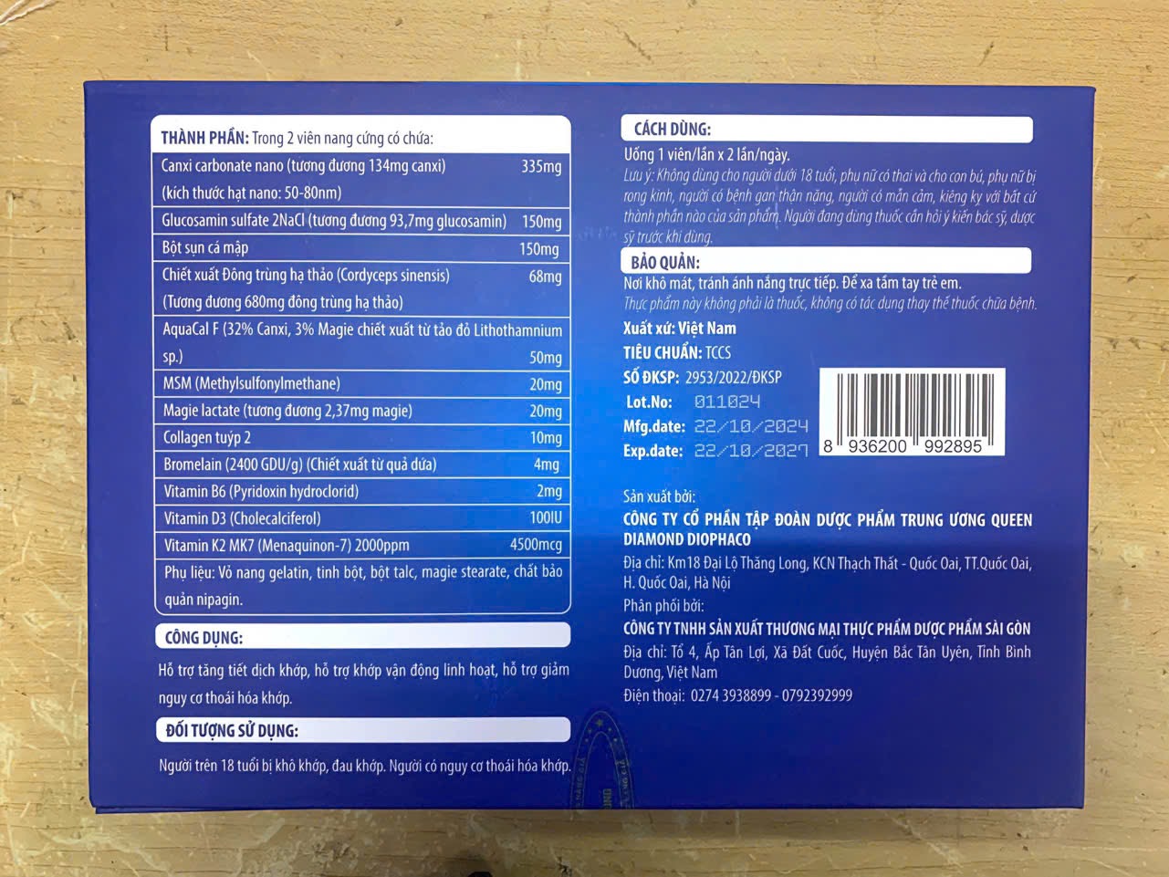 - THÀNH PHẦN Bột đông trùng hạ thảo (cordyceps sinensis): 900mg Glucosamine sulfate potassium chloride: 600mg Shark cartilage (sụn cá mập): 450mg Aquamin F (tương đương canxi 70,4mg): 220mg Canxi carbonat nano (tương đương canxi 80mg): 200mg MSM (Methylsufonylmethane): 100mg Magnesium lactat: 60mg Collagen tuýp II: 30mg Bromelain (chiết xuât từ quả dứa): 15mg Nano curcumin: 15mg Vitamin K2 (menaquinone 7-MK7) 2000ppm: 4500mcg Vitamin B6 (pyrdoxin HCl): 3mg Vitamin D3 (Cholecalciferol): 300IU Phụ liệu: Talc, magnesium stearat, tinh bột vừa đủ.