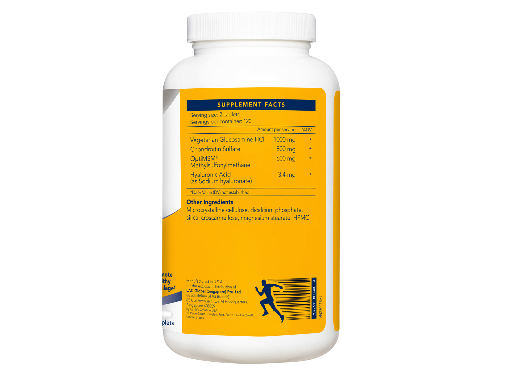 Thành phần Trong 2 viên nén chứa: - Glucosamine sulphate (glucosamine: 590mg): 1000mg - MSM (methyl sulfonyl methane): 600mg - Chondroitin sulphate: 400mg - Bột nghệ (Curcuma Longa L.): 300mg - Vitamin C (L-ascorbic acid):