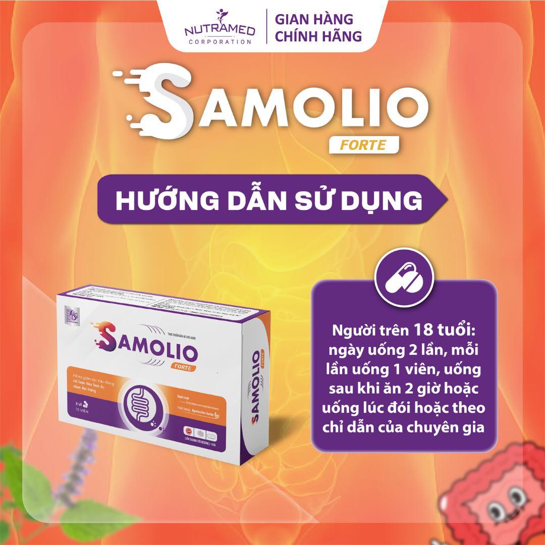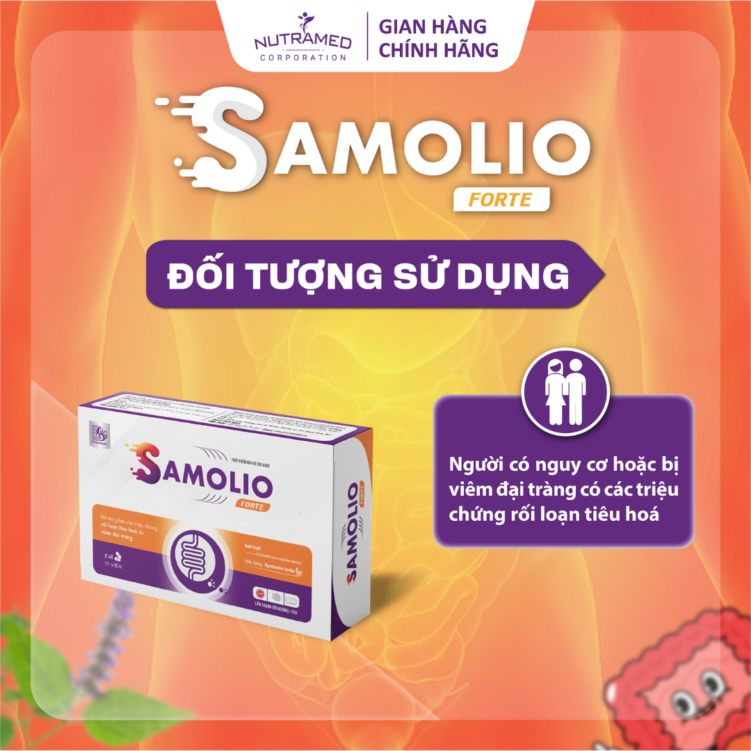 SAMOLIO FORTE - Hỗ trợ giảm các triệu chứng rối loạn tiêu hoá do viêm đại tràng   THÀNH PHẦN ️Chiết xuất Bạch truật; Chiết xuất Bạch thược; Chiết xuất Phòng phong; Chiết xuất Trần bì; Chiết xuất Hoắc hương; Chiết xuất từ Hoàng bá.   CÔNG DỤNG ️Hỗ trợ giảm nguy cơ viêm đại tràng. ️Hỗ trợ giảm các triệu chứng rối loạn do viêm đại tràng.   ĐỐI TƯỢNG SỬ DỤNG ️ Người có nguy cơ hoặc bị viêm đại tràng có các triệu chứng rối loạn tiêu hoá   HƯỚNG DẪN SỬ DỤNG ️ Người lớn: ngày uống 2 lần, lần 1 viên, uống sau ăn 2 giờ hoặc uống lúc đói hoặc theo chỉ dẫn của chuyên gia.   KHÔNG SỬ DỤNG TRONG TRƯỜNG HỢP ️ Không dùng sản phẩm cho người mẫn cảm với bất kỳ thành phần nào của sản phẩm ️ Phụ nữ có thai và đang cho con bú   LƯU Ý ️ Sản phẩm này không phải là thuốc và không có tác dụng thay thế thuốc chữa bệnh.   BẢO QUẢN ️ Để nơi khô ráo, nhiệt độ dưới 30°C tránh ánh nắng mặt trời. Để xa tầm tay trẻ em   THÔNG TIN SẢN PHẨM Tên sản phẩm: SAMOLIO FORTE Quy cách: Hộp 30 viên Hạn sử dụng: 3 năm từ ngày sản xuất Tiêu chuẩn: TCCS   _ NUTRAMED - KHƠI NGUỒN KHOA HỌC TỚI CUỘC SỐNG   Nhà máy đạt chuẩn WHO – GMP. Nguyên liệu được kiểm tra chất lượng khắt khe bởi nhà máy đạt chuẩn GMP.