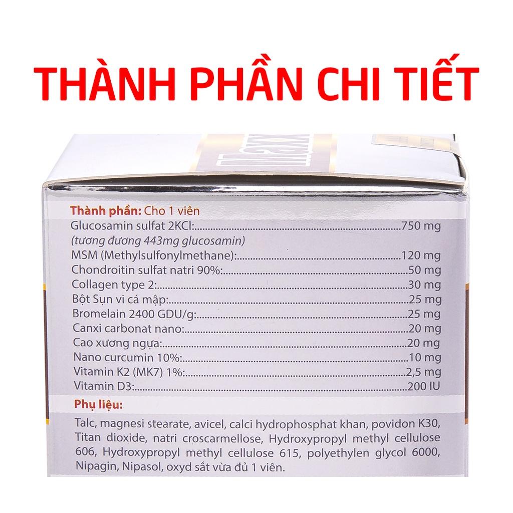 Thành phần : Trong mỗi viên nén có chứa: - Glucosamin sulphate 2 NaCl 750mg. - MSM (Methysulfonylmethane) 50mg, Calci gluconate 100mg, Cao xương ngựa bạch 70mg, Chondroitin sulphate 50mg, Collagen type II 30mg, sụn