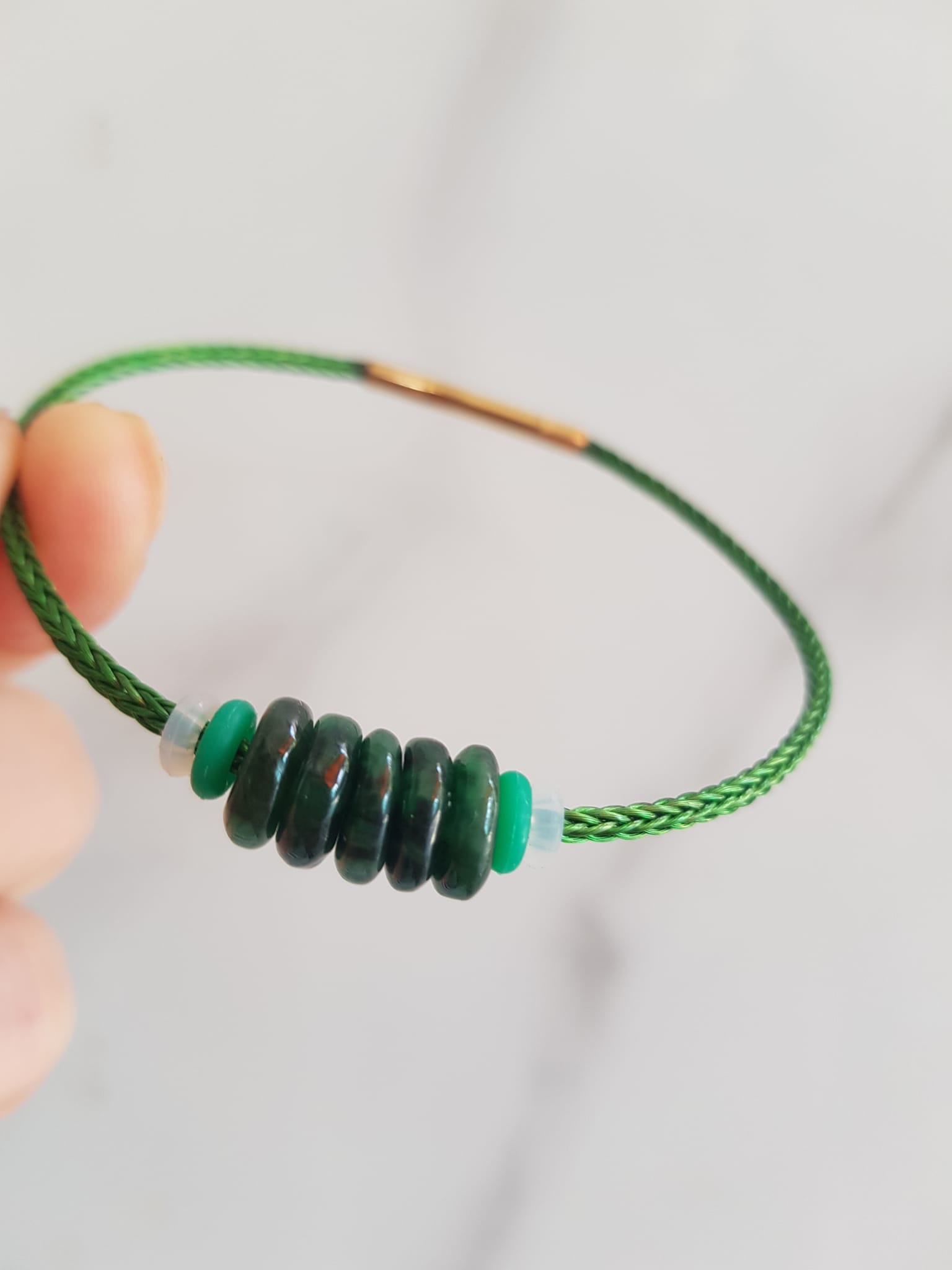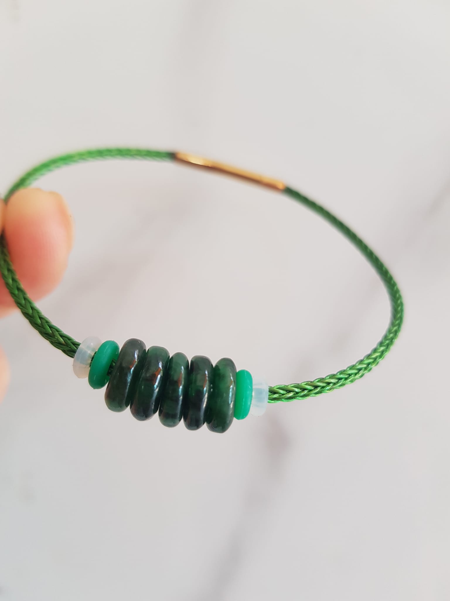 Vòng tay phong thủy nữ charm kiểu 5 đồng tiền Xanh Đậm dây xanh may mắn Đá cẩm thạch tự nhiên xanh đậm đẹp phối dây màu xan có khoen chắc chắn Hợp nữ mệnh