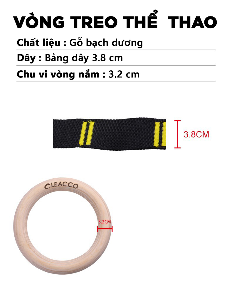 Vòng Treo Gỗ Tập Gym Gymnastic Rings Cleacco Bộ vòng xà tay tập thể dục Vòng treo Gymnastic Rings là Vòng treo hay còn gọi là xà vòng, xà xích, vòng crossfit… trong tiếng Anh