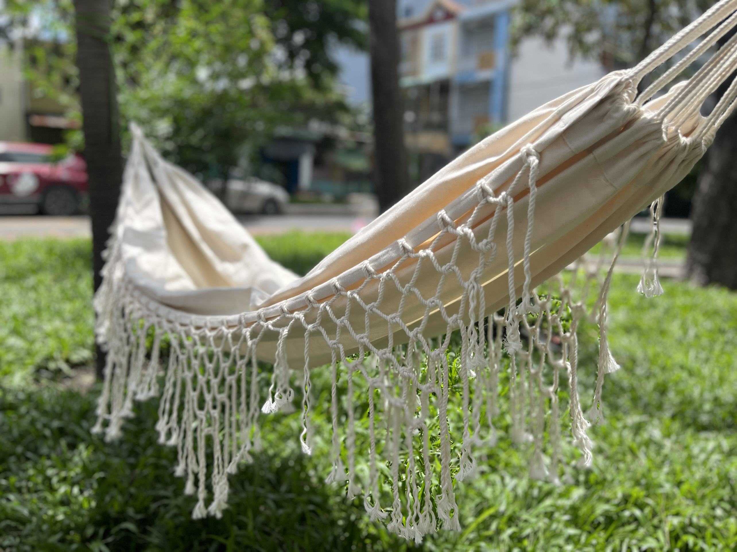 - Đặc biệt võng vải được thiết kế với viền tua rua hai bên, được đan thắt thủ công bởi đôi bàn tay khéo léo của những nghệ nhân tay nghê cao, cùng với chất liệu sợi cotton màu mộc tự nhiên tạo nên chút thơ mộng, mộc mạc cho chiếc võng