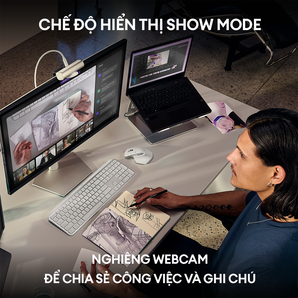 Các nút điều khiển trên webcam cho phép bạn điều chỉnh ánh sáng và cân bằng trắng chính xác với ISO, Tốc độ màn trập, Nhiệt độ, Sắc thái màu và Độ rung. Micrô đa hướng kép làm giảm âm thanh nền để bạn có thể được nghe thấy rõ ràng với công nghệ giảm tiếng ồn. Chế độ Hiển thị (Show Mode) cho phép bạn chia sẻ công việc và ghi chú của mình trong cuộc gọi video bằng cách nghiêng camera web xuống.