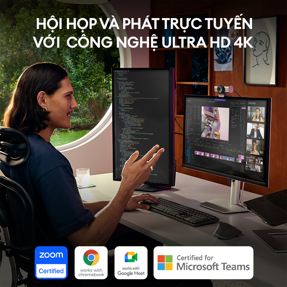 Tương Thích Tối Đa: Webcam Ultra HD USB C Logitech MX Brio hiệu quả tốt với Windows, macOS, ChromeOS hoặc Linux. Được chứng nhận bởi Zoom, Microsoft Teams, Chromebook, Google Meet và Streamlabs