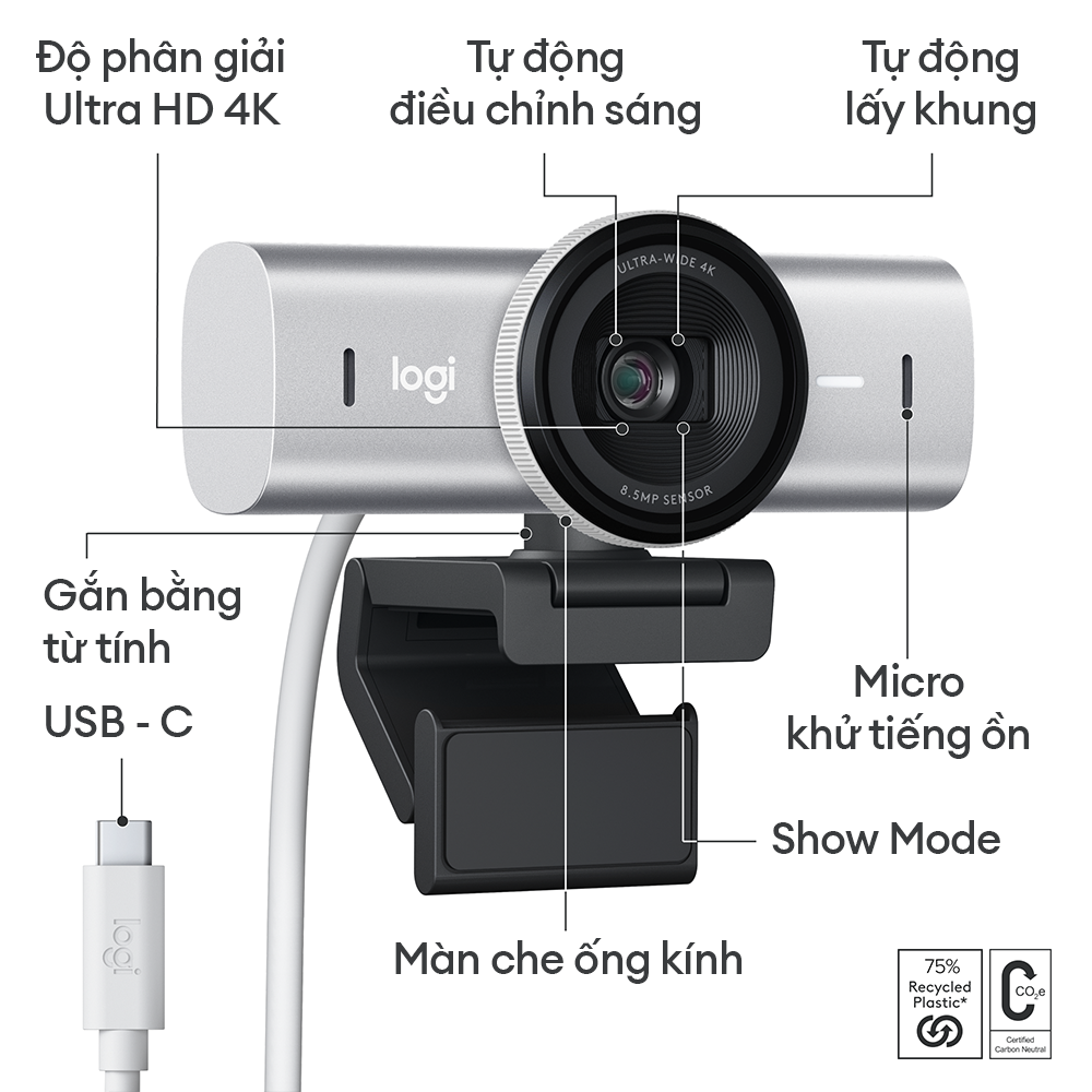 Webcam Ultra HD 4K Logitech MX Brio được làm với ít nhất 34% nhựa sau tiêu dùng đã được chứng nhận giúp giảm lượng khí thải các-bon