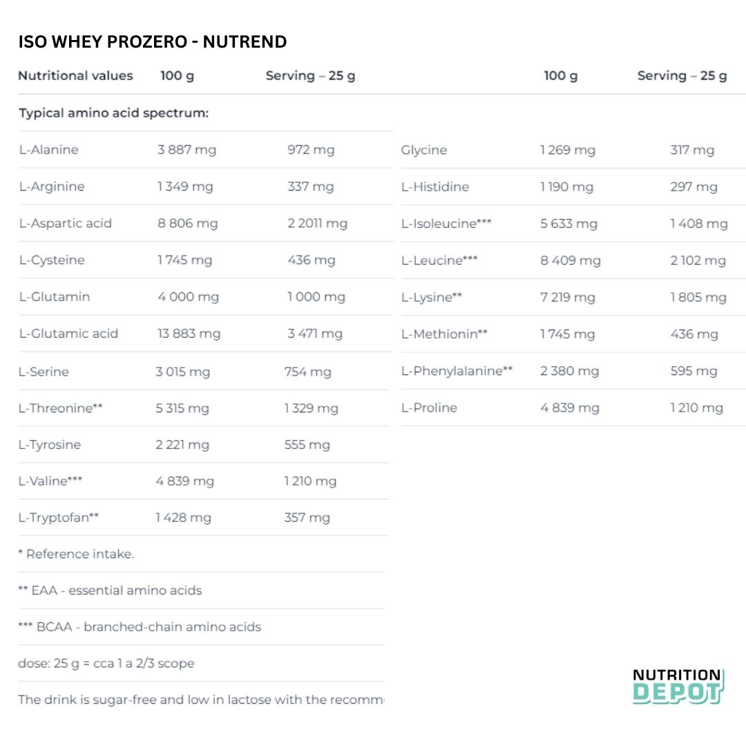 - Nutrend ISO WHEY Prozero với thành phần từ 100% whey Isolate chất lượng cao, không chứa đường, không gluten và rất ít lactose hỗ trợ xây dựng và tăng trưởng cơ bắp tối ưu, phù hợp ngay cả với những người ăn kiêng ít carbohydrate và người có vấn để về lactose trong sữa bò.