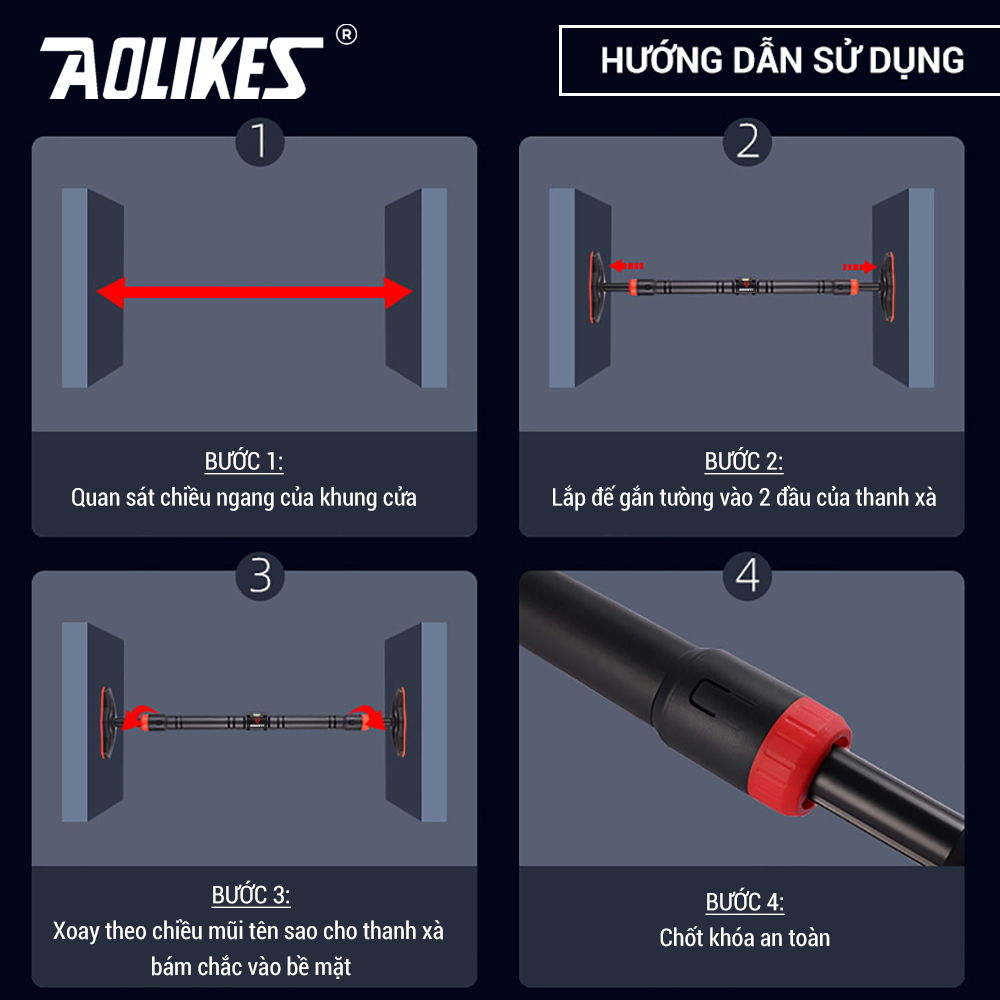 Xà đơn gắn cửa treo tường AOLIKES A-SW213 thiết kế thân xà được làm từ thép sơn tĩnh điện có thể chống chịu lực tới 200kg, chốt khóa xoay an toàn ở 2 đầu thanh xà, thước thủy để đo cân bằng tiện dụng.