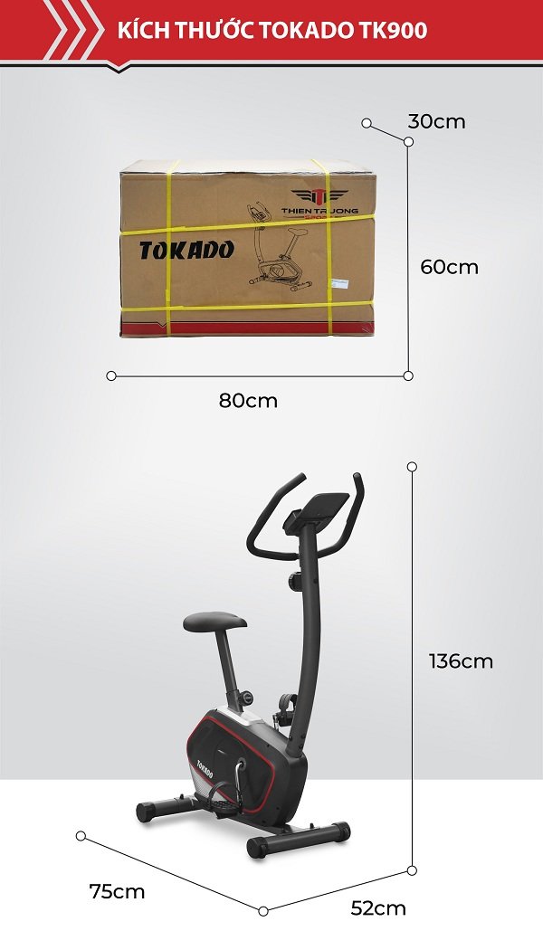 1. Thông tin xe đạp tập thể dục Tokado TK900. - Mã sản phẩm: TK900. - Thương hiệu: Tokado. - Xuất xứ: Trung Quốc. Xe đạp tập thể dục Tokado TK900 với thiết kế nhỏ