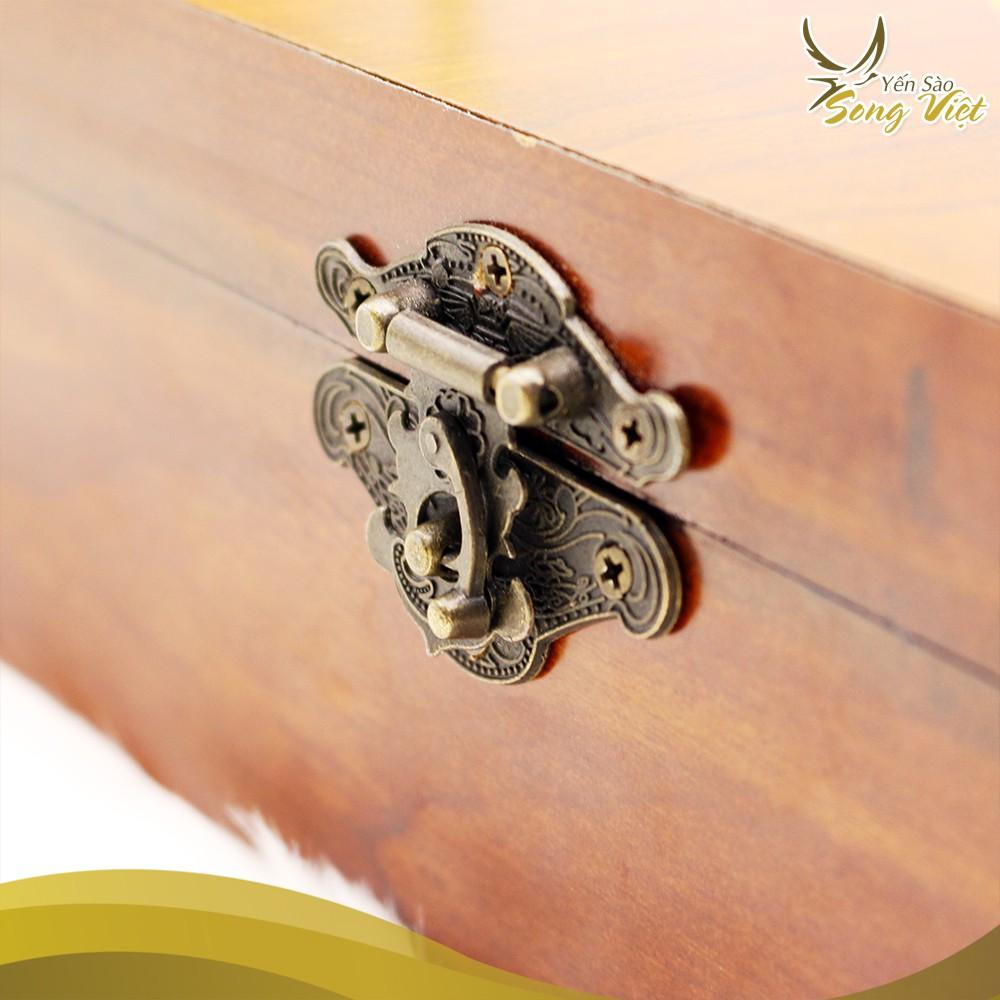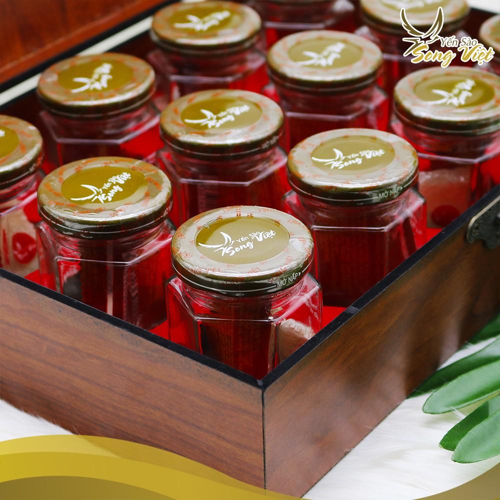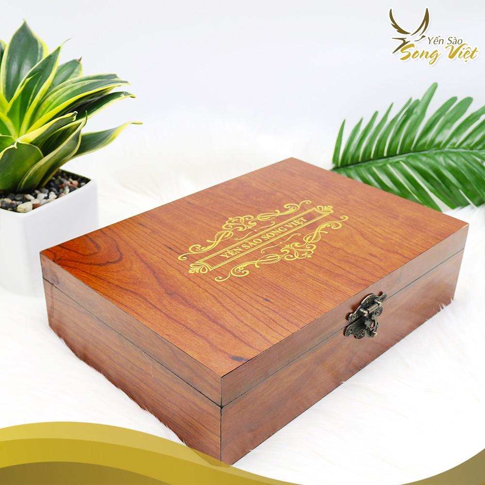 Hộp gỗ chữ nhật kích thước 31x22x8 (cm) Gồm 12 phần yến, mỗi phần 1,5 g + 12 gói đường phèn, mỗi gói 7 g Tặng kèm 12 hũ thủy tinh tiệt trùng dùng để