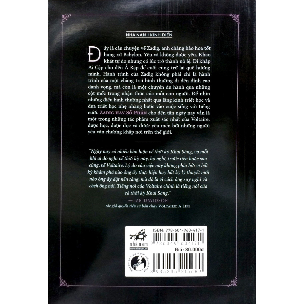 Đây là câu chuyện về Zadig, anh chàng hào hoa tốt bụng xứ Babylon. Yêu và không được yêu. Khao khát tự do nhưng có lúc trở thành nô lệ. Đi khắp Ai Cập cho đến Ả Rập để cuối cùng trở lại quê hương mình. Hành trình của Zadig không phải chỉ là hành trình của một chàng trai bình thường đi đến đỉnh cao danh vọng, mà còn là một chuyến du hành qua những cột mốc trong nhận thức của mỗi con người. Để nhìn những điều bình thường nhất qua lăng kính triết học và đưa triết học nhẹ nhàng bước vào cuộc sống với tiếng cười. Zadig, hay Số Phận cho đến tận ngày nay vẫn là một trong những tác phẩm xuất sắc nhất của Voltaire, được học, được đọc và  được yêu mến bởi những người yêu văn chương khắp nơi trên thế giới.
