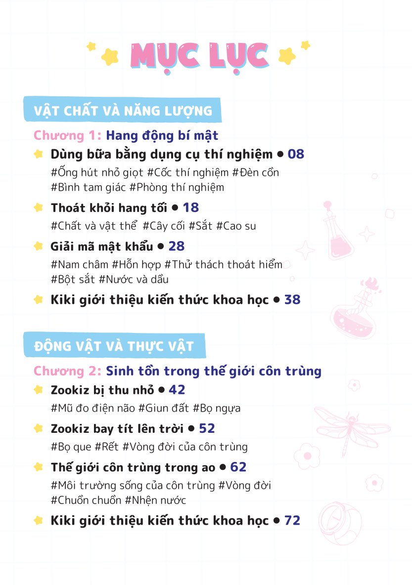 Mua tại TiktokNhóm Zookiz quy tụ những bạn nhỏ tinh nghịch mà đáng yêu: thỏ Kiki láu lỉnh, gấu Bongbong ham ăn, “hổ chó” Alex hay càu nhàu, chuột cảnh Ppuyo ngốc nghếch, lười Nana điệu đà, chó xù Pang ham vui. Theo chân Zookiz, các độc giả nhỏ sẽ bước vào những cuộc phiêu lưu kì thú và hài hước tại trường khoa học bí ẩn đồng thời học thêm nhiều kiến thức bổ ích.